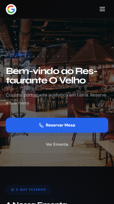 Domínio .pt próprio, SEO para aparecer no Google, responsivo em qualquer ecrã e rápido a carregar. Galeria, horário e serviços incluídos.